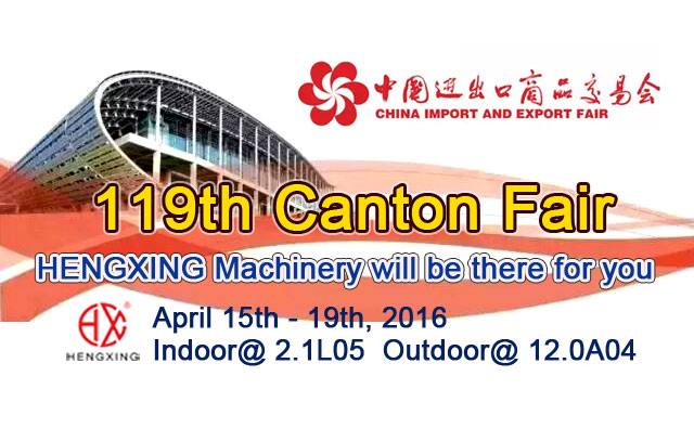 119th Canton Fair-HENGXING Machinery will be there for you! April 15th -19th, 2016 Indoor@ 2.1L05 Outdoor@ 12.0A04 。