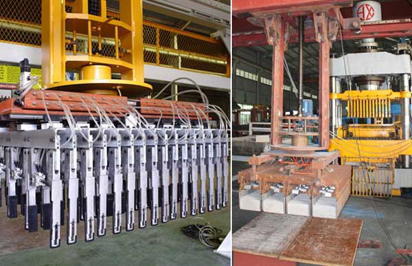 當切坯機(jī)把切好的磚坯推(tui)到分坯闆上後,分(fen)坯缸伸出,帶動分(fen)坯闆張開對磚坯(pī)進行分縫動作,磚(zhuan)坯分縫完成後升(shēng)♉降缸下降。當夾盤(pan)到達預定夾坯位(wei)置後,夾盤夾具工(gong)作,夾起磚坯,接着(zhe)由升降缸提開夾(jiá)盤至預定高度,分(fen)坯缸伸出張開磚(zhuān)坯🔞間風道,行走裝(zhuāng)置驅動碼坯機行(háng)走至窯車正上方(fāng),旋轉裝置完成轉(zhuǎn)向90°,然後開降缸下(xià)降至預定放坯高(gāo)度,夾盤夾具張開(kāi)把磚坯碼放在窯(yáo)車上,碼坯機碼放(fang)一層,旋轉一層,形(xíng)成十字交叉,經過(guo)上述動作💋循環,即(ji)可♍完成窯車的全(quán)部碼坯過程。
